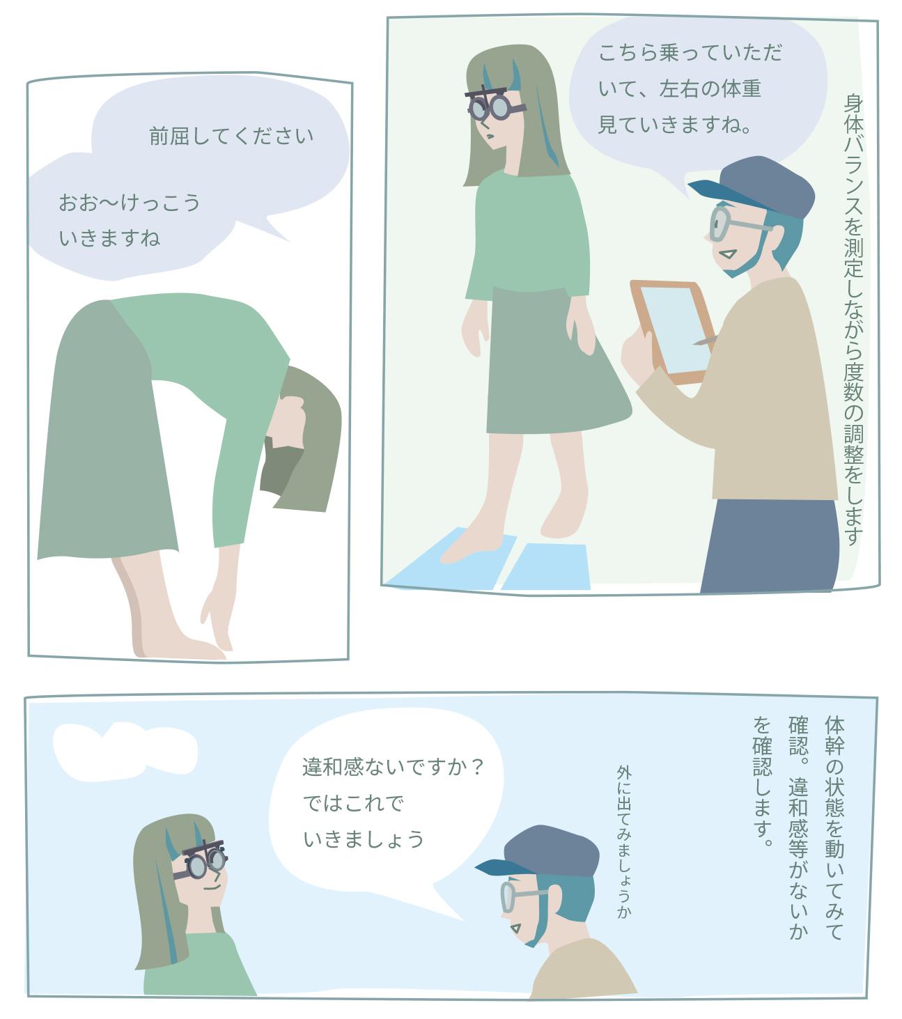 左右の体重バランス測定しながら度数の調整・身体の伸び具合(度数による身体の 左右の緊張と弛みを確認)前屈・後屈等で試していただきます。